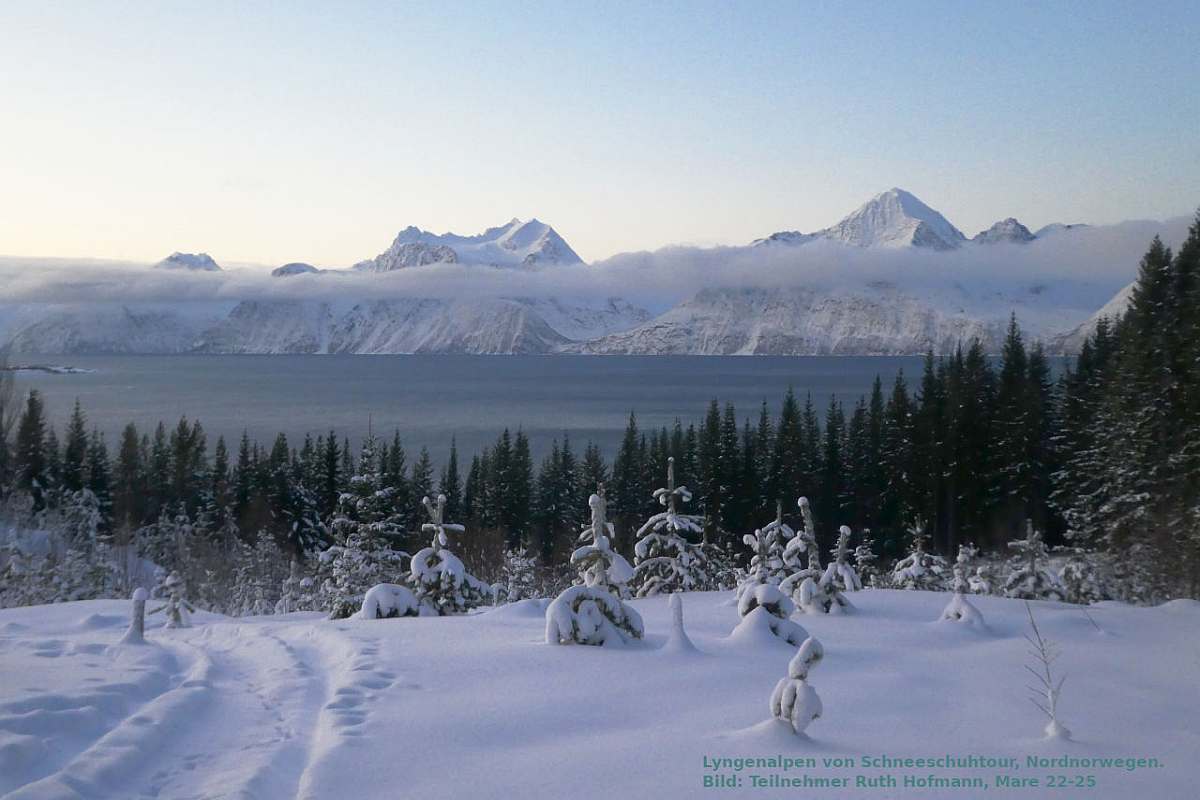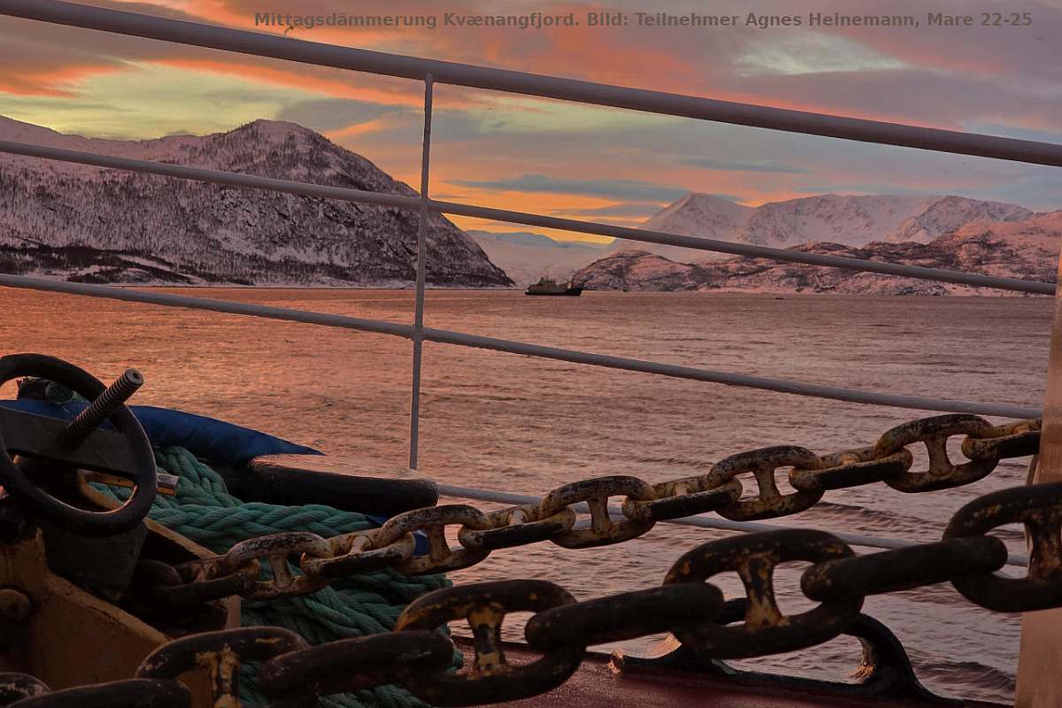 Neben den Walen ist das Nordlicht die andere leicht vermittelbare Attraktion dieser Fahrten, aber neben Walen und Nordlicht liegt ihr weiteres Geheimnis im Zauber der winterlichen Berg- und Fjordlandschaft, mit dem nahtlosen Übergang einer späten Morgendämmerung in eine frühe Abenddämmerung samt all der damit verbundenen Pastelltöne, den langen Nachtstunden, die nicht nur die Chance auf Nordlichtbeobachtung erhöhen, sondern zusammen mit dem hellen, selbst Sternenlicht reflektierenden Schnee zum Einen auch Nachtwanderungen erlaubt, und zum Anderen für eine weihnachtlich-friedvolle Winterstimmung sorgt, die wirkliches Entspannen, Seele-baumeln-lassen, ermöglicht. Und die CAPE RACE mit ihrem gediegenen, klassischen Charme und familiär-kleiner Gästezahl (maximal 12, plus 7 Crew) unterstützt dies bestens.