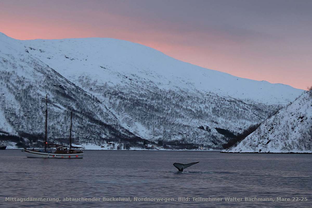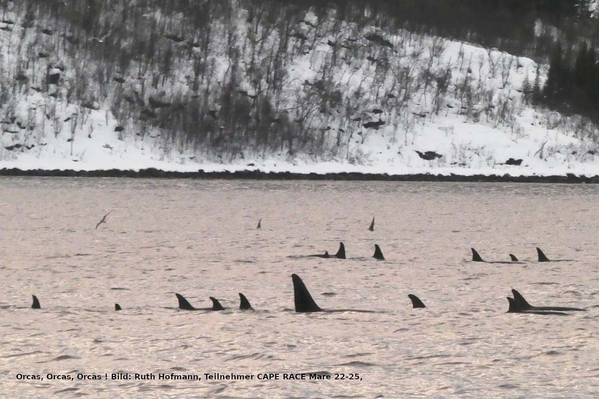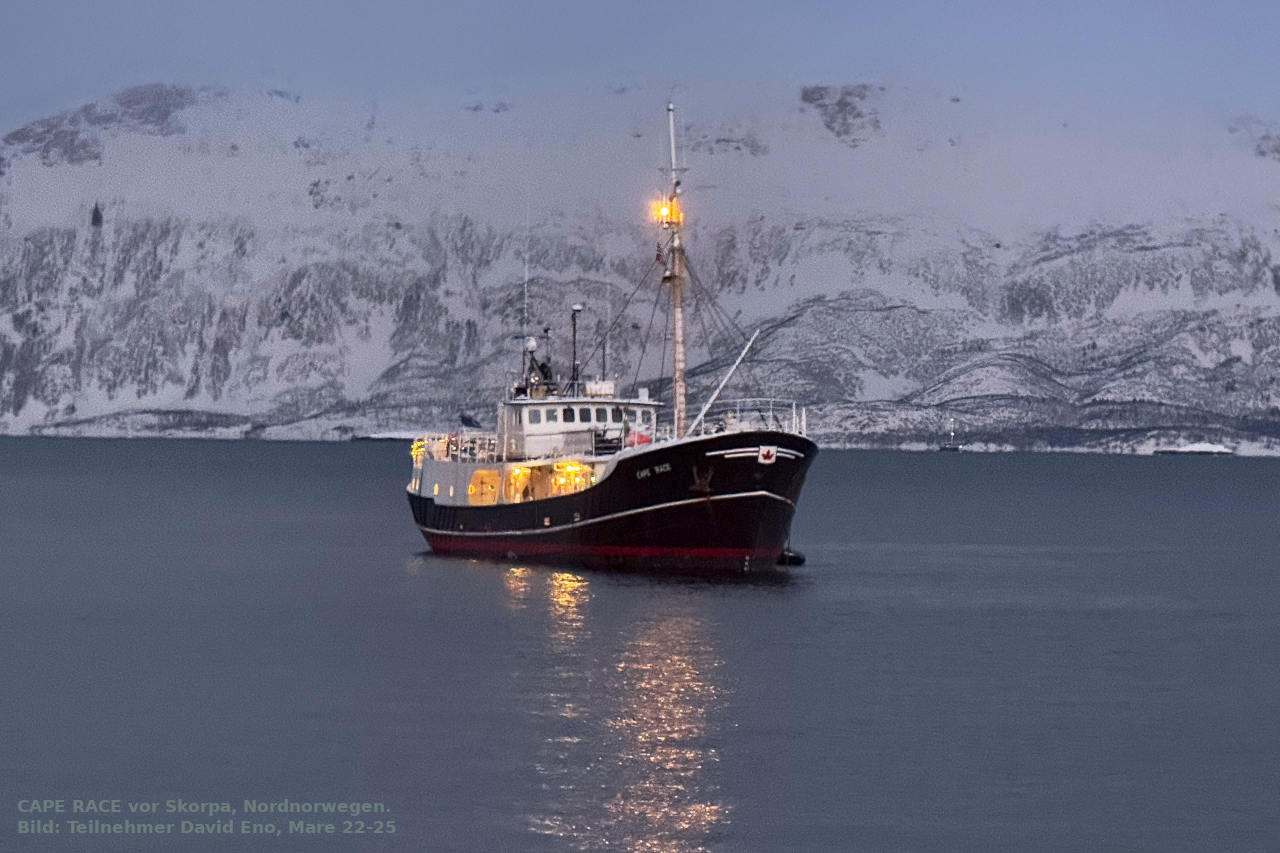 'Start und Endpunkt ist jeweils Tromsö, das eindeutige Zentrum des norwegischen Nordens, und von dort steuert die CAPE RACE in den einwöchigen Reisen jeweils das Gebiet des Kvænangenfjords als den östlichsten Teil der Fahrten an – ein Fjord, der seit ca. 2017 nicht nur von riesigen Heringsschwärmen im Winter aufgesucht wird, von denen sich dort zahlreiche Orcas und Buckelwale ernähren, sondern der auch weit genug von Tromsö entfernt liegt, dass er nicht von Massen von Tagesausflugs-Schnellbooten überrollt werden kann. Wir sind dort zwar nicht allein, aber doch deutlich ungestörter, als dies in stadtnäheren Walbeobachtungsgebieten der Fall wäre.