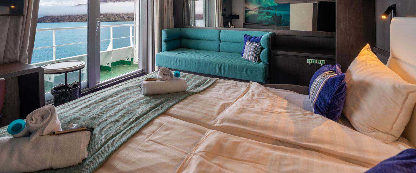 Das Schiff bietet Raum für max. 170 Passagiere in 80 Kabinen, die alle jeweils mit Dusche und WC ausgestattet sind. Die geräumigen Kabinen variieren von luxuriösen Suiten mit eigenem Balkon, Suiten, Superior Kabinen, Twin Fenster-Kabinen und Bullaugen-Kabinen sowie Drei-, und Vierbett-Kabinen mit Bullaugen.